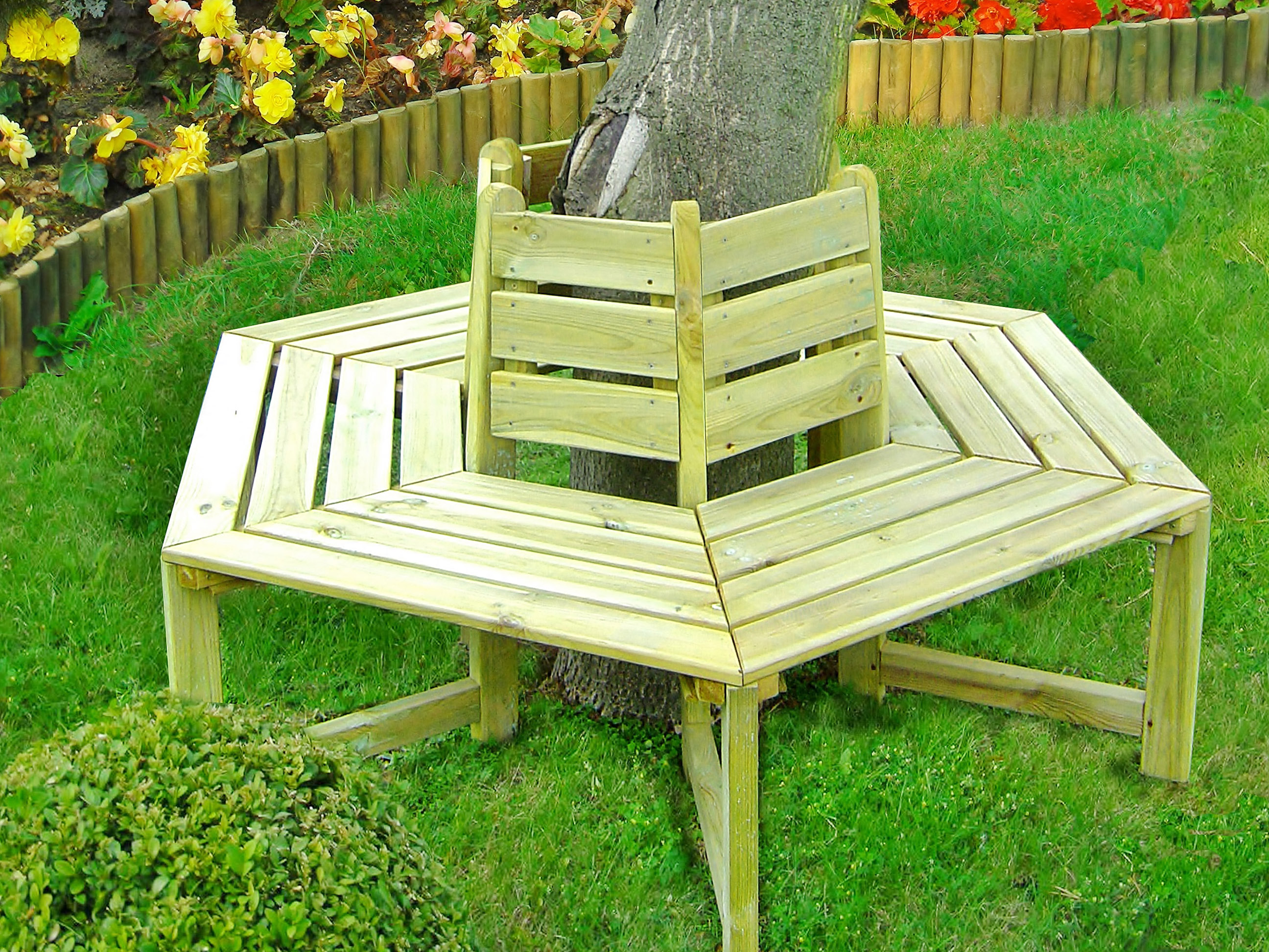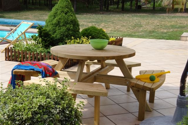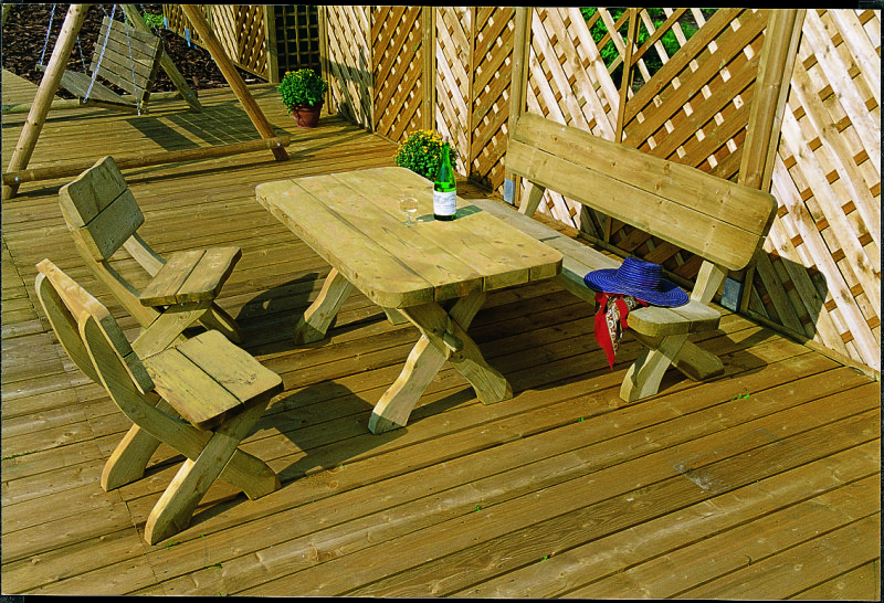 als Rundtisch im Durchmesser 110 cm, Stühle und Bank ohne Armlehnen,